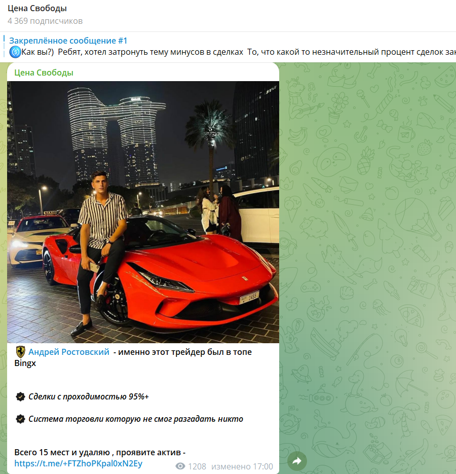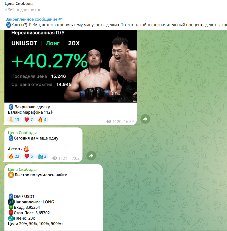 В Telegram существует анонимный криптотрейдер, основавший канал с громким названием «Цена Свободы». Автор проекта не раскрывает своего имени, но делится торговыми сигналами и предлагает подписчикам просто повторять его сделки — заходите, смотрите, копируйте и зарабатывайте.