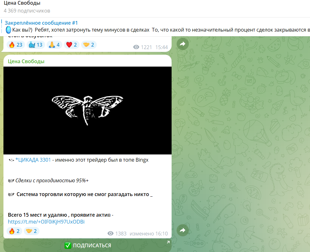 О паблике “Цена Свободы” в интернете ни слова. Отзывов нет: ни положительных, ни отрицательных. Ничего в соцсетях, на форумах или сайтах с мониторингами. Канал словно существует отдельно от всей крипто-среды — без обратной связи и независимого мнения.