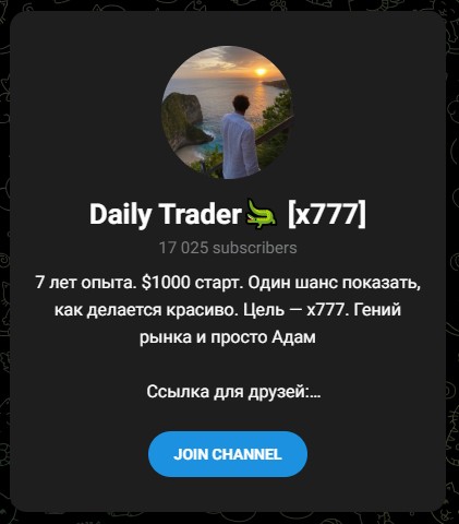 Телеграм-канал Daily Trader x777 – это личный блог некоего «гения рынка и просто Адама». Автор, судя по его словам, уже 7 лет успешно торгует криптой и готов поделиться своим успехом с подписчиками. Проект обещает научить «заходить идеально в каждую сделку» и гарантирует чуть ли не 400% профита.