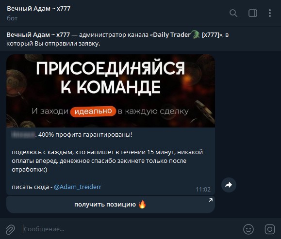 Сам канал «Дейли Трейдер» закрытый, и чтобы в него попасть, нужно сначала подать заявку. Сразу после этого с вами связывается бот, и начинается основная «обработка». С помощью бота «Вечный Адам» делает предложение, от которого, по мнению мошенников, невозможно отказаться:- обещают нереальную, гарантированную прибыль в 400% с одной сделки;