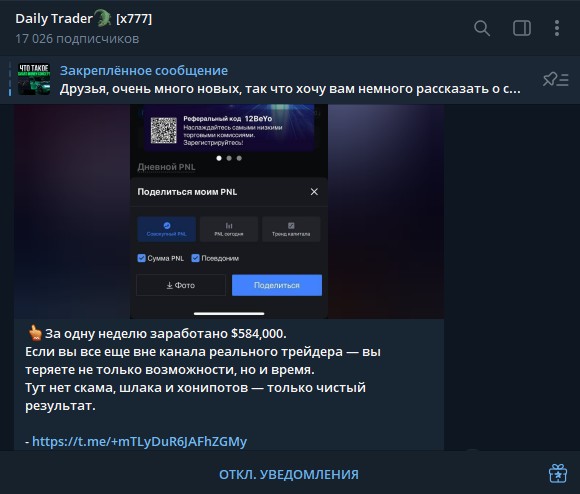 Телеграмм-канал Daily Trader x777 отзывы в сети пока еще не «заслужил», хотя проект появился в сентябре 2024-го и собрал на момент обзора аж 17 тысяч подписчиков. Поэтому мы решили провести свое расследование и выяснить, в чем же тут дело.