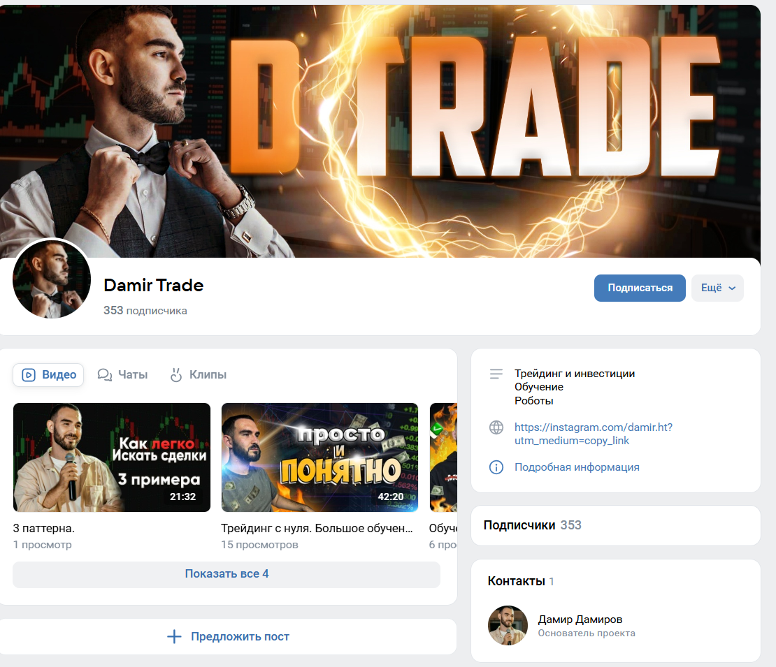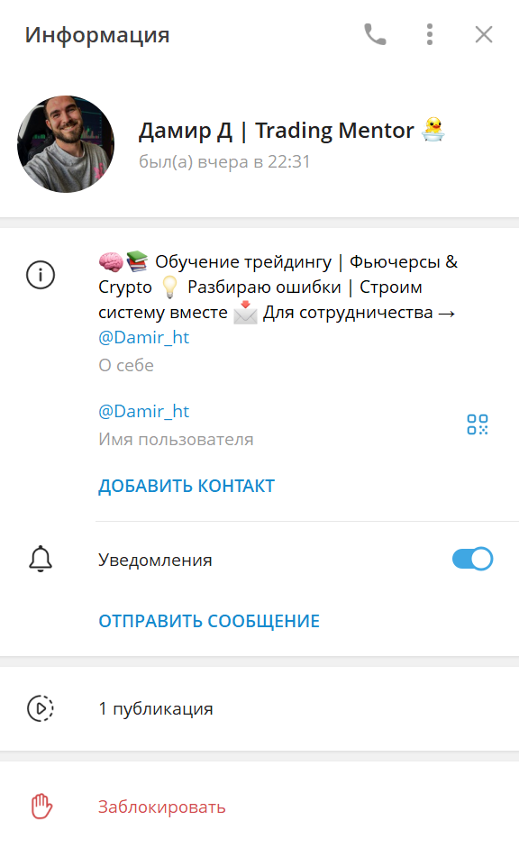 Основным каналом связи служит группа под названием Damir Trade. Но на текущий момент телеграм-сообщество очищено от контента. Аватарка удалена, публикации стерты, а сам канал неактивен с 2023 года. Администратор Дамир не указывает дополнительных контактных данных. В постах упоминались переходы в приватные чаты для эксклюзивных сетапов или обсуждений, но они создавались временно и блокировались после взаимодействия с пользователями.