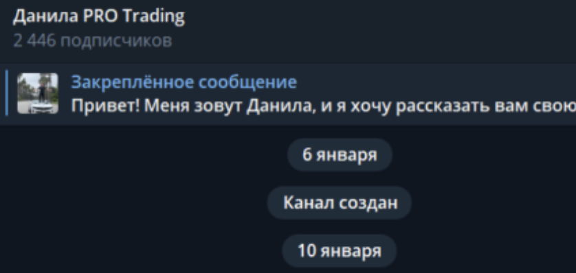 Телеграм-канал «Данила PRO Trading» был создан 6 января 2025-го года. То есть просуществовал он всего около месяца.