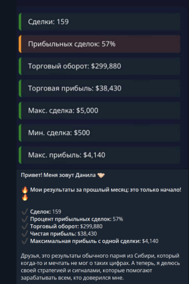 «Данила PRO Trading» — канал в Телеграмм, на котором молодой человек, представляясь инвестором, предлагает следовать его советам по трейдингу. Утверждает, что его аналитика имеет проходимость в 57%.