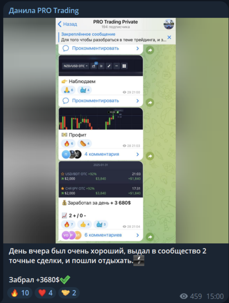 «Данила Pro Trading» — телеграмм-канал, который просуществовал всего около месяца. Его автор предлагал бесплатных доступ к випке с торговыми сигналами. Для этого нужно было зарегистрироваться и начать торговать на платформе Pocket Option.