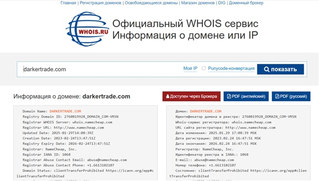 Домен сайта Darkertrade Com был зарегистрирован 24 февраля 2023 года. В январе 2025 года в доменный адрес вносились некоторые изменения. Сроком окончания регистрации платформы указан февраль 2026 года. Очень похоже, что домен был приобретен компанией у сторонних лиц. Иначе бы владельцы сервиса указали датой создания 2023 год.