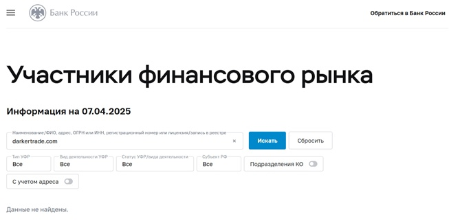 Компания «Даркер Трейд» не публикует на сайте информацию об имеющихся лицензионных разрешениях. Мы проверили онлайн-обменник «Даркертрейд» на официальном сайте Центрального Банка России. Выяснилось, что у организации нет необходимой для работы лицензии. Это также указывает на недобросовестность фирмы Darker Trade.