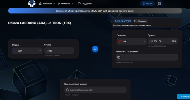 Чтобы обменять криптовалюту, на площадке Darkertrade Com не нужно создавать аккаунт. Следует указать, какую валюту и на какую сумму хотите обменять, какую хотите получить, прописать свой счет tron и адрес электронной почты.Владельцы обменника «Даркер Трейд» позиционируют себя лидерами рынка обмена цифровых валют. Компания заявляет, что за время работы сервиса было совершено свыше 755 тысяч обменов в более чем 4 тысяч направлениях. Площадкой воспользовались около 300 тысяч пользователей. Среднее время обработки заявки занимает 7 минут. Служба поддержки готова прийти на помощь 24/7.