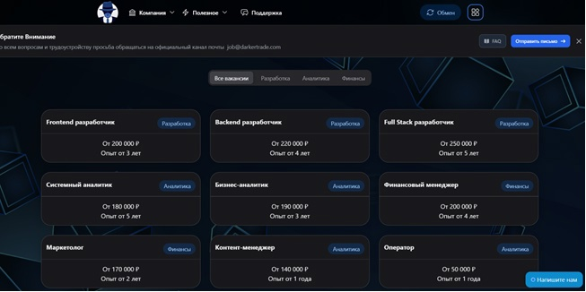 На сайте предусмотрен список доступных вакансий в команду Darker Trade. Фирме требуются системный аналитик, маркетолог, финансовый менеджер, Full Stack-разработчик и другие. Заявленная заработная плата для соискателей составляет от 50 тысяч рублей до 250 тысяч рублей в зависимости от вакансии.