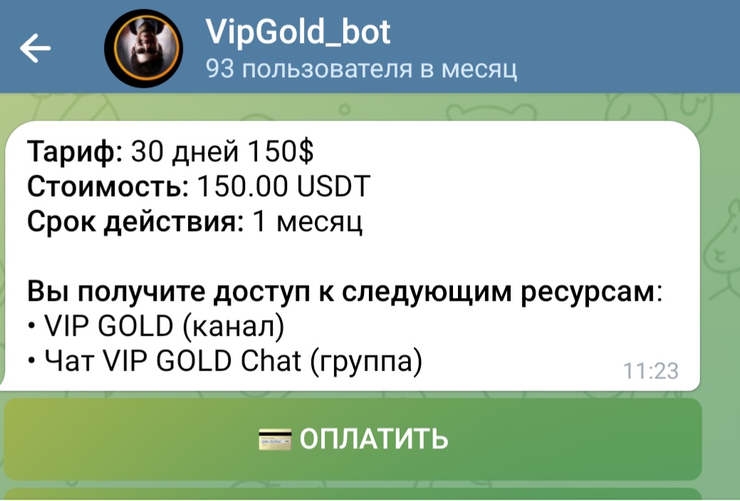 После оплаты через бот обещают выдать доступ к VIP-каналу и чату VIP Gold Chat.
