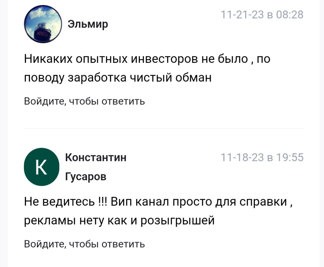 Отзывы на сторонних веб-ресурсах негативные. Пишут, что после перевода денег открывается доступ к каналу, который не содержит никаких схем заработка, в личных сообщениях автор также не присылает свои алгоритмы, крайне редко выходит на связь. После получения оплаты трейдер обычно блокирует подписчиков. С примерами таких комментариев можно ознакомиться ниже: