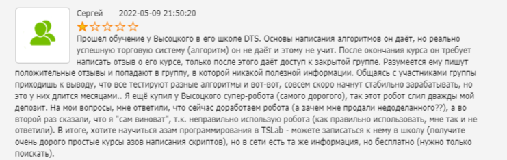Мы однозначно не рекомендуем инвестировать в обучение Daytradingschool Дмитрия Высоцкого. Пользователи просто зря потратят деньги и время, если поверят этому аферисту. Полученными навыками невозможно воспользоваться. При реальном трейдинге стратегии, которые предлагает Высоцкий, приведут к сливу депозитов.