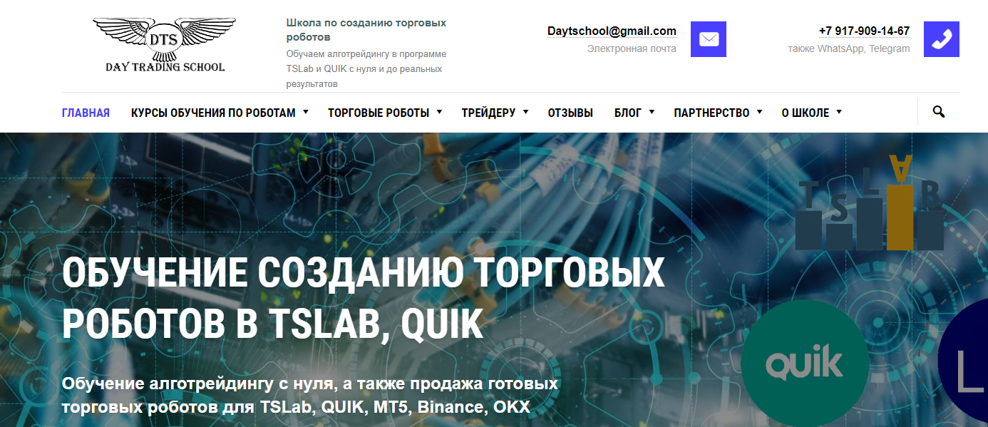 Daytradingschool – это проект трейдера Дмитрия Высоцкого, в котором он обещает клиентам курсы, в которых обучают созданию торговых роботов и алготрейдингу. Основной продукт — Школа по созданию торговых роботов Алготрейдинг. Вся работа ведется на платформе TSLab. Обучение включает теоретические и практические занятия. На них ученики изучают алгоритмические стратегии, создают и настраивают торговых роботов. А также, судя по утверждению разработчика, ученики Day Trading School получают доступ к готовым скриптам и системам. При этом, у пользователей, которые прошли обучение на курсе у Дмитрия Высоцкого, вложилось максимально негативное впечатление о полученных знаниях.