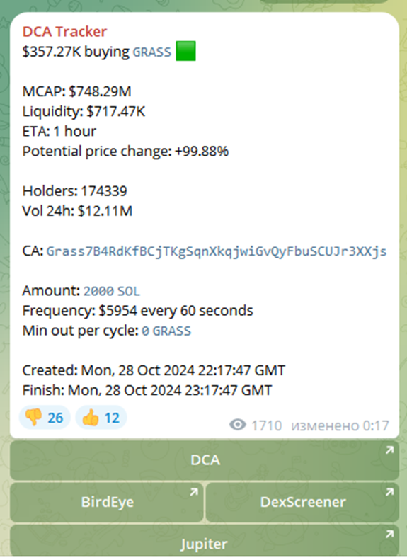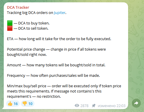 «ДСА Трекер» – программа, отслеживающая крупные DCA-ордеры на криптовалютной бирже Jupiter AG. Бот создан анонимным разработчиком, заявляющим, что это фан-проект, который не планируется активно монетизировать и выводить в категорию массового продукта. По мнению владельца, услуги закрытой группы подойдут активным трейдерам, которые вовлечены в криптовалютную торговлю.