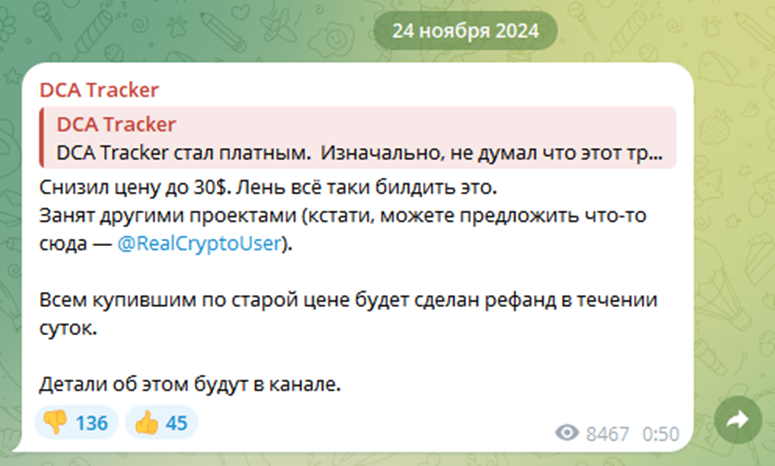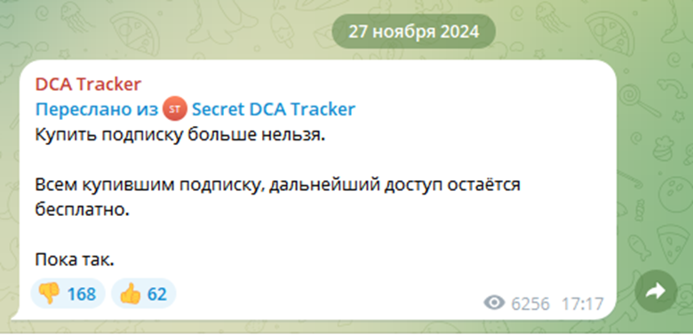 27 ноября 2024 создатель DcaTracker сообщил о приостановке продажи доступа к закрытой группе. При этом для людей, успевших оплатить услугу, бот продолжит работать в привычном режиме.