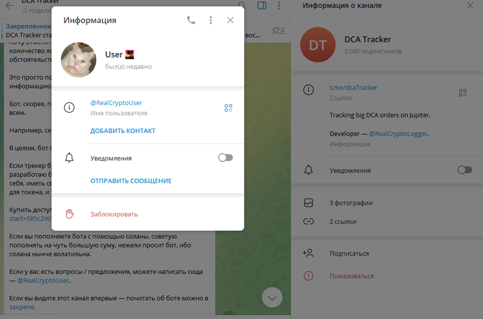Этот профиль связан с двумя телеграм-каналами. ТГ «ДЦА Трекер» – официальная лента бота с 3K+ подписчиков. Здесь публикуется информация о проекте, а также некоторые сигналы из закрытой группы.