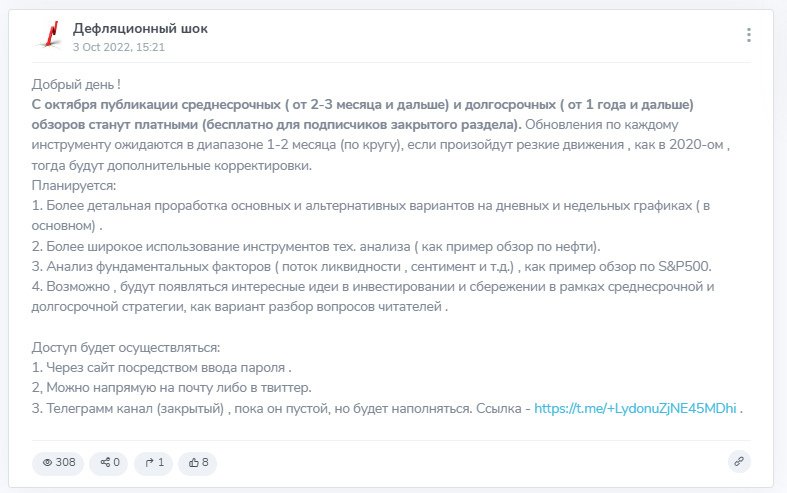 Дефляционный Шок — аналитика по методу волнового и циклического способов исследования графиков. Услуга платная, но ее стоимость не озвучивается в публичном пространстве. Из минусов проекта: