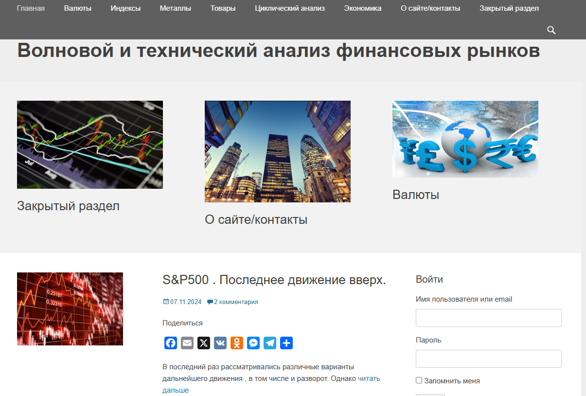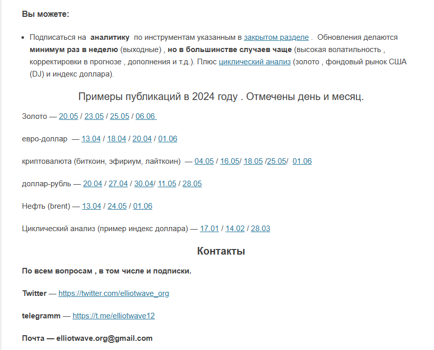 В закрытом разделе можно получать аналитику по валютам, индексам, металлам, товарам. Используются волновой и циклический анализ. Обновления делаются не реже 1 раза в неделю, как правило, на выходных. Но если ситуация на рынке кардинально меняется, апдейт будет выложен в elliotwave своевременно.