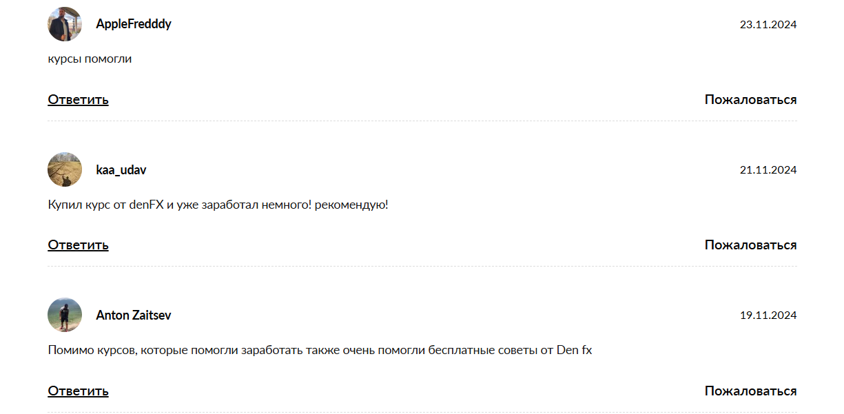 Такие положительные рецензии показывают, что благодаря проекту, скорее всего, действительно можно получить прибыль или, по крайней мере, воспользоваться советами, которые трейдер раздает бесплатно. Негативных мнений о Den FX нет.