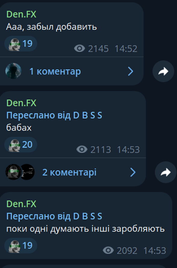 Анализ показал, что практически на каждой из площадок среди постов есть ссылки на курсы обучения DenFxServer. При этом в них сохраняется и бесплатный контент в достаточном количестве. На основном тг-канале насчитывается почти 3 тысячи подписчиков. В среднем, количество просмотров постов составляет 2-2,5 тысячи, что является очень высоким показателем и можно говорить об отсутствии накрутки. Первый пост появился в марте 2023 года.