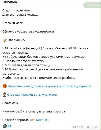 Автор проекта DenFX Education предлагает всем желающим все свои знания о специальных методах торговли на бирже в формате платного курса за 500 баксов. Программа обучения Den FX предполагает «пожизненный доступ к закрытому торговому серверу» DenfxServer со знаниями от якобы опытного и известного по первому впечатлению трейдера.