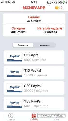 Каждая 1 000 кредитов в «Мани апп» равняется $1. Заказать выплату можно в нижней вкладке посередине — «Платежи». На декабрь 2025 года обналичивание пока доступно только с помощью PayPal, который не работает с пользователями из РФ, а это значит, что перевести деньги клиентам из России можно будет только по иностранным реквизитам.