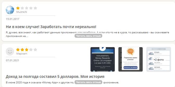 Другой пользователь пишет, что скачала программу еще в 2020 и в итоге за полгода ей удалось заработать всего лишь $5. Она уверена, что потратила это время зря, а еще упоминает, что за некоторые задания и вовсе не начислили баллы. Также клиент считает, что такое частое скачивание больших приложений может навредить устройству и привести к его перегреву.