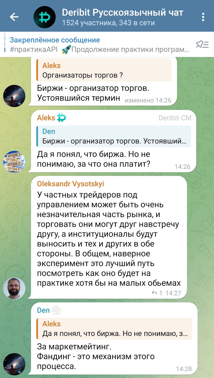 Для общения пользователей биржи был создан “ru deribit — русскоязычный чат” в телеграм. В нем состоит 1525 человек. Общение ведется неактивно. Официального тг канала у Дерибит нет.