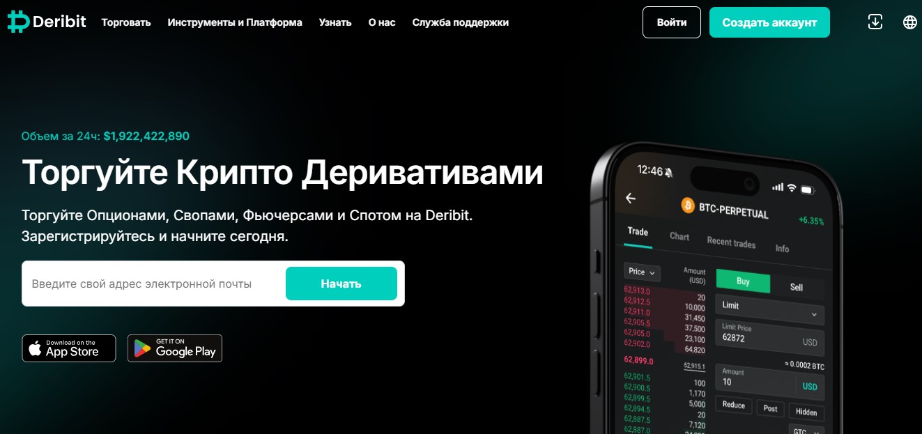 Услуги биржи доступны на deribit com. Ежедневно через эту платформу заключают сделок на 1900000000$. Для удобства работы разработчики предлагают мобильное приложение Дерибит, которое можно скачать с Google Play или App Store.