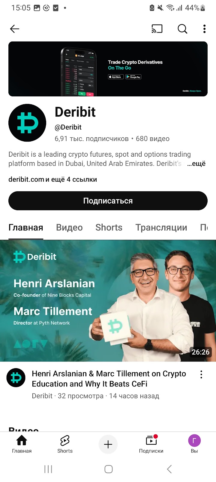Есть у проекта и канал на Ютуб, зарегистрированный под ником Deribit. В группе состоит 6,9К человек и выложено 680 видео с описанием преимуществ биржи, ее обновлений. Ролики набирают около 30-50 просмотров и практически не обсуждаются. Есть видео с более 10000 просмотрами, при этом с малым количеством комментариев, что может указывать на накрутку активностей ботами.