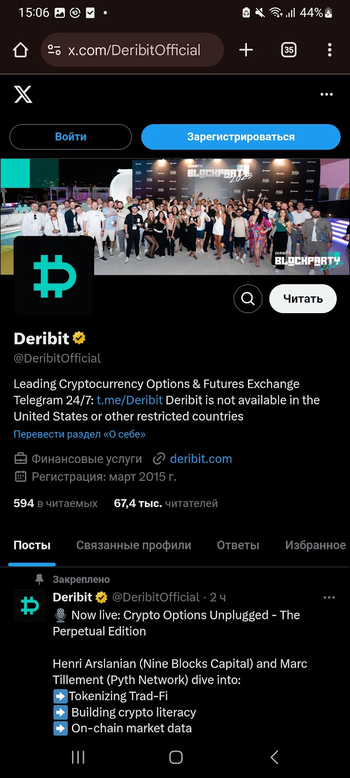 Продвигаются услуги биржи через страницу в соцсети Х “Deribit” (DeribitOfficial). У нее 67,4К читателей, выкладываются новости по работе криптовалютной площадки. Вовлеченность подписчиков в реакции и обсуждения не превышает 1%.