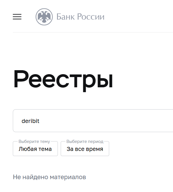 На бирже Дерибит дается краткое описание, но из него непонятно, кому она принадлежит и кем регулируется. На территории России эта платформа оказывает услуги незаконно, поскольку ее не было найдено в реестре Центробанка.