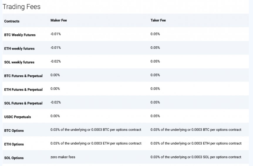 Дерибит использует комиссионную модель maker-taker. С суммы сделок мейкеров взимается 0,01-0,03%, а тейкеров — 0,5%.