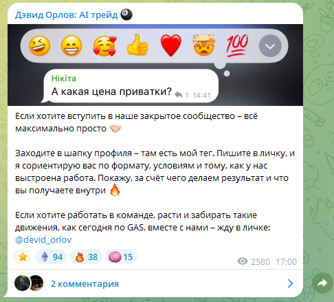В своем паблике Дэвид рассказывает, что торгует на бирже с помощью ИИ-агентов. Предлагает подписчикам и гостям канала присоединиться к проекту, что может показаться выгодным. Мы проверили его работу и готовы рассказать о том, Дэвид Орлов — скам-трейдер или ему можно доверять.