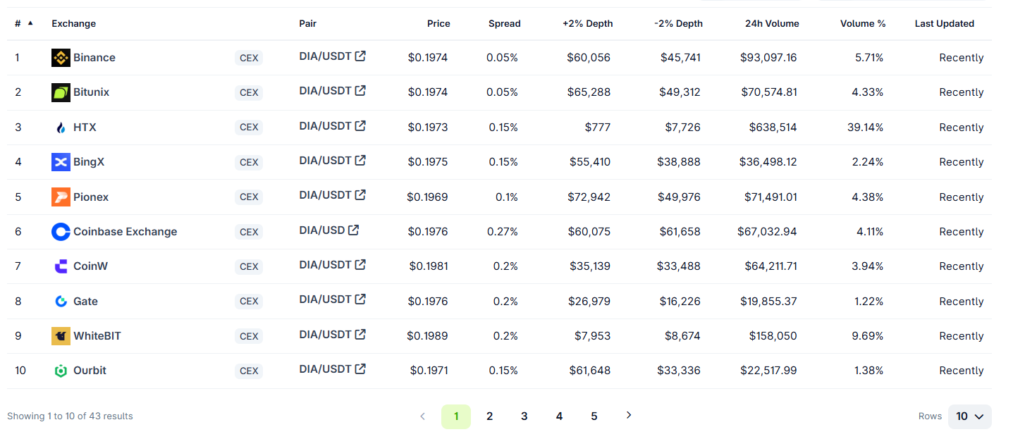 Чтобы оценить перспективность и надежность токена, прежде всего стоит обратить внимание на то, где он представлен. Наличие в списке крупных централизованных бирж – обычно хороший сигнал. DIA USDC Pool как раз представлен на огромном количестве известных площадок. Однако это вызывает лишь минимальное доверие, но не более.