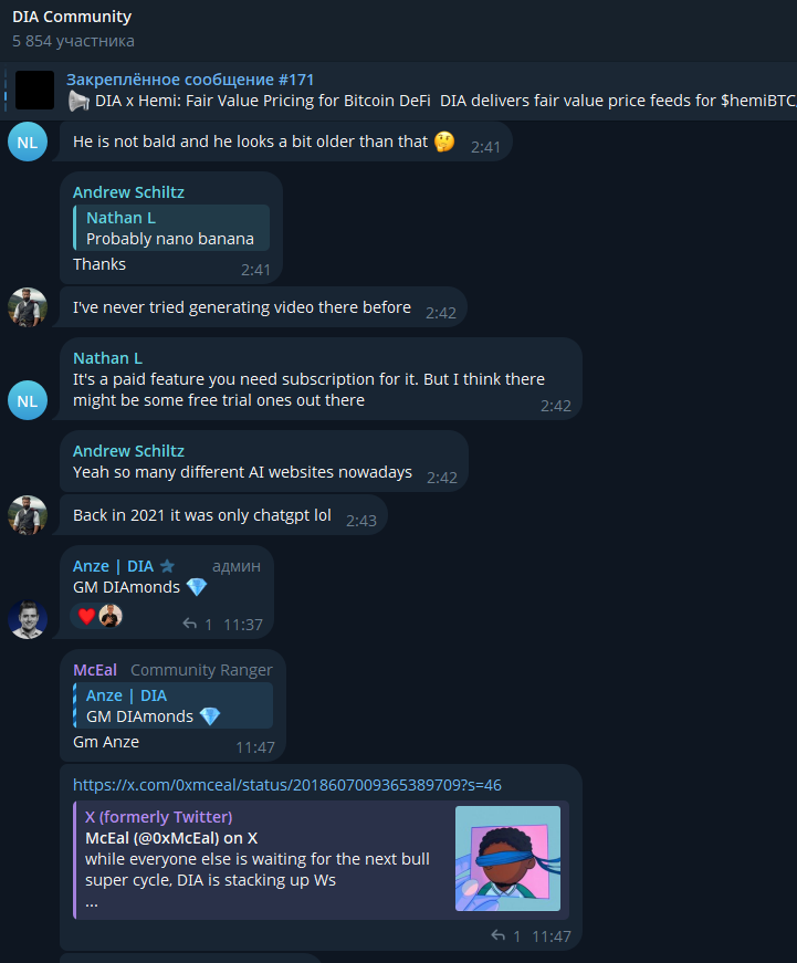 В то же время чат DIA Community в Telegram мы не можем назвать активным. Состоят тут лишь 5,8 тыс. участников, что относительно немного. Однако основная проблема в том, что обсуждение почти не ведется: ежедневно появляется по несколько сообщений, но это явно не то, что можно было бы ожидать.
