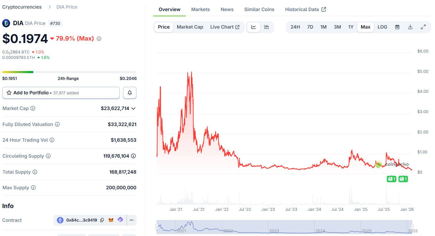 • курс сейчас очень далек от исторического максимума и ближе к минимальному значению, тем не менее стоимость DIA USDC достигала $1 еще в июле 2025-го;