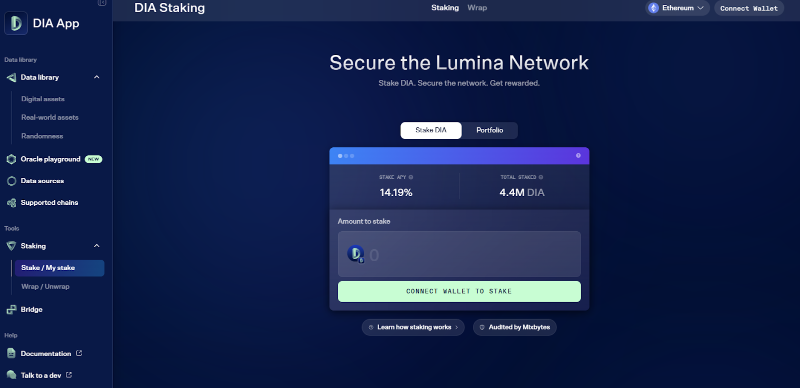 В DIA App можно наконец узнать немного больше о самой монете. То, что она используется внутри экосистемы, это и так очевидно. Что касается заработка на активе, то трейдерам могут предложить стейкинг с не самым плохим APY – 14,19%. Вот только ожидаемую доходность можно было назвать значительной, если бы коин показывал устойчивый рост. Здесь же есть высокие риски потерять деньги при падении крипты в цене.