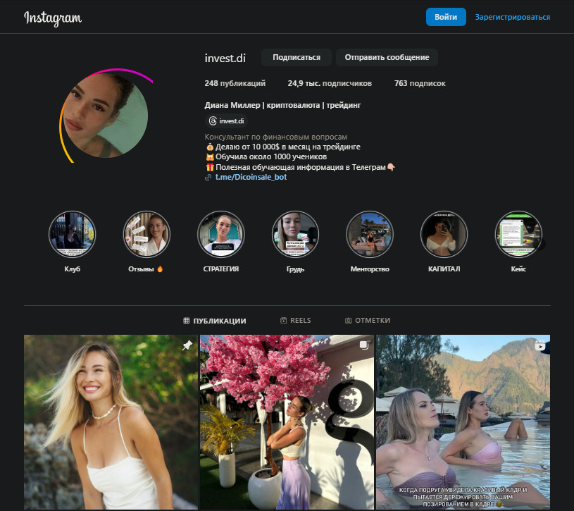 Кроме проектов в Telegram трейдер Диана Миллер ведет блог в «Инстаграм». У нее почти 25 тысяч подписчиков, и в тематическом разделе, разумеется, представлены исключительно положительные отзывы. Здесь же в списке публикаций доступны: