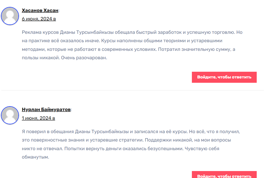О Диане Турсынбайкызы отзывов в сети почти нет. В своем Инстаграм девушка публикует положительные комментарии учеников в виде скриншотов из ТГ, но таким отзывам доверять не имеет смысла, слишком легко подделать. А вот на независимых сайтах удалось найти информацию, что качество обучения у Дианы низкое, результатов у учеников нет. Да и если бы девушка действительно 10 лет успешно торговала на финансовых рынках, ей не составило бы труда показать верифицированную статистику сделок.