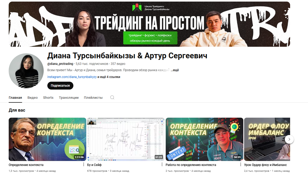 - Ютуб diana protrading — 5,6 тысячи подписчиков, в бесплатном доступе есть курс для начинающих, уроки с Дианой, уроки с Артуром и ролики обзора рынка.