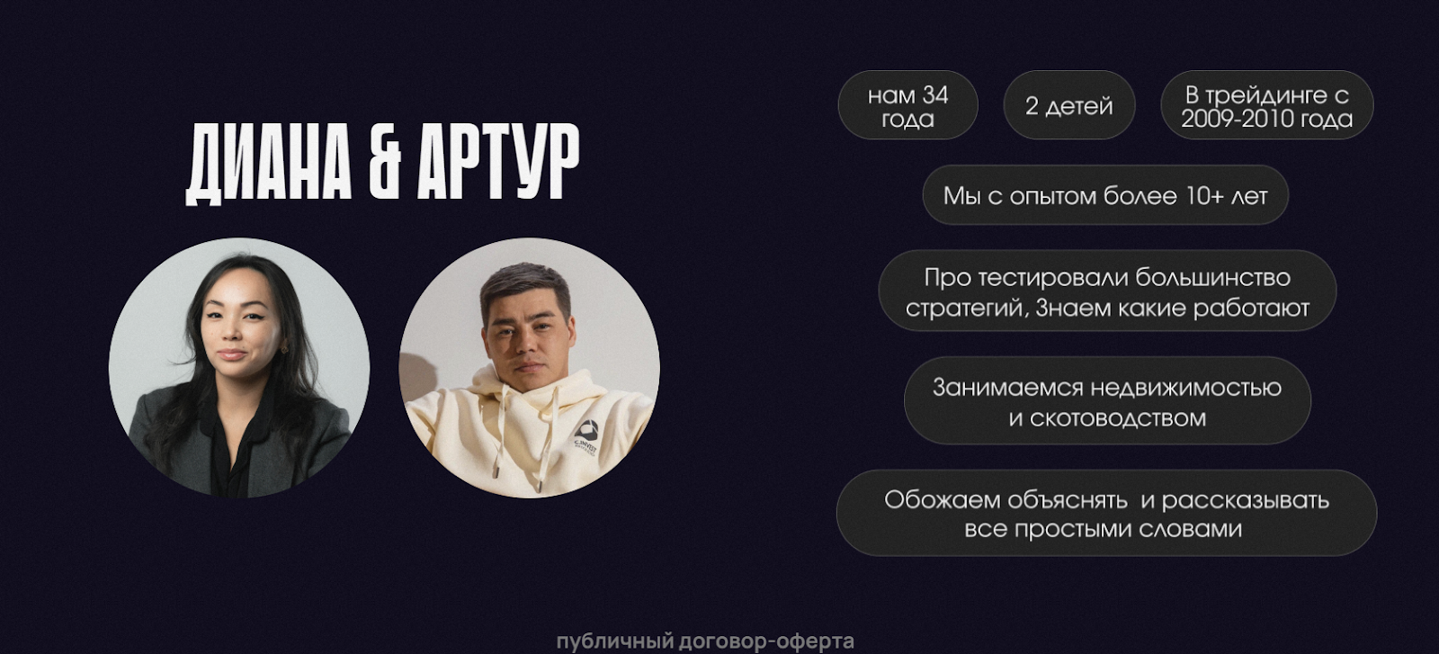 Трейдинг с Дианой Турсынбайкызы обещает полное понимание рынка, качественную и доходную стратегию, а также умение управлять своими эмоциями и справляться с разными психологическими состояниями.
