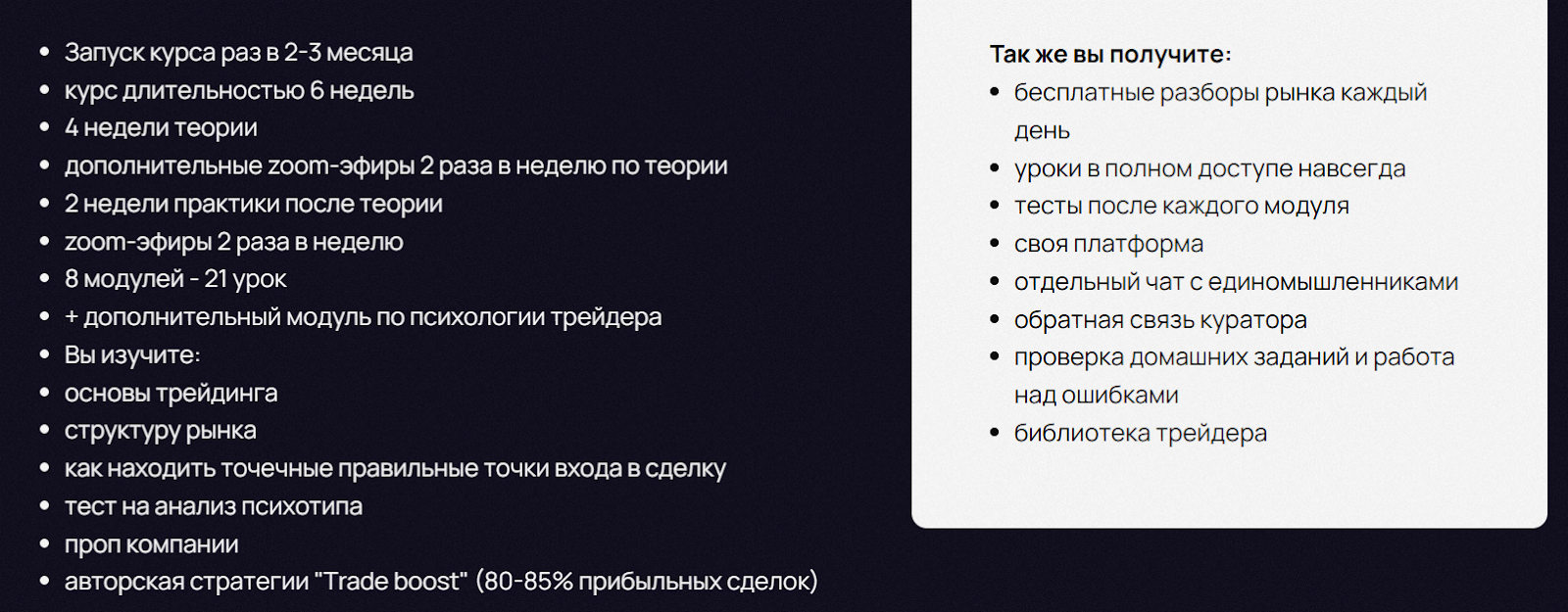 - программа С нуля до профи — цена не указана, в обучение входят материалы в записи, 2 эфира в неделю, 2 недели практики и психология трейдинга;