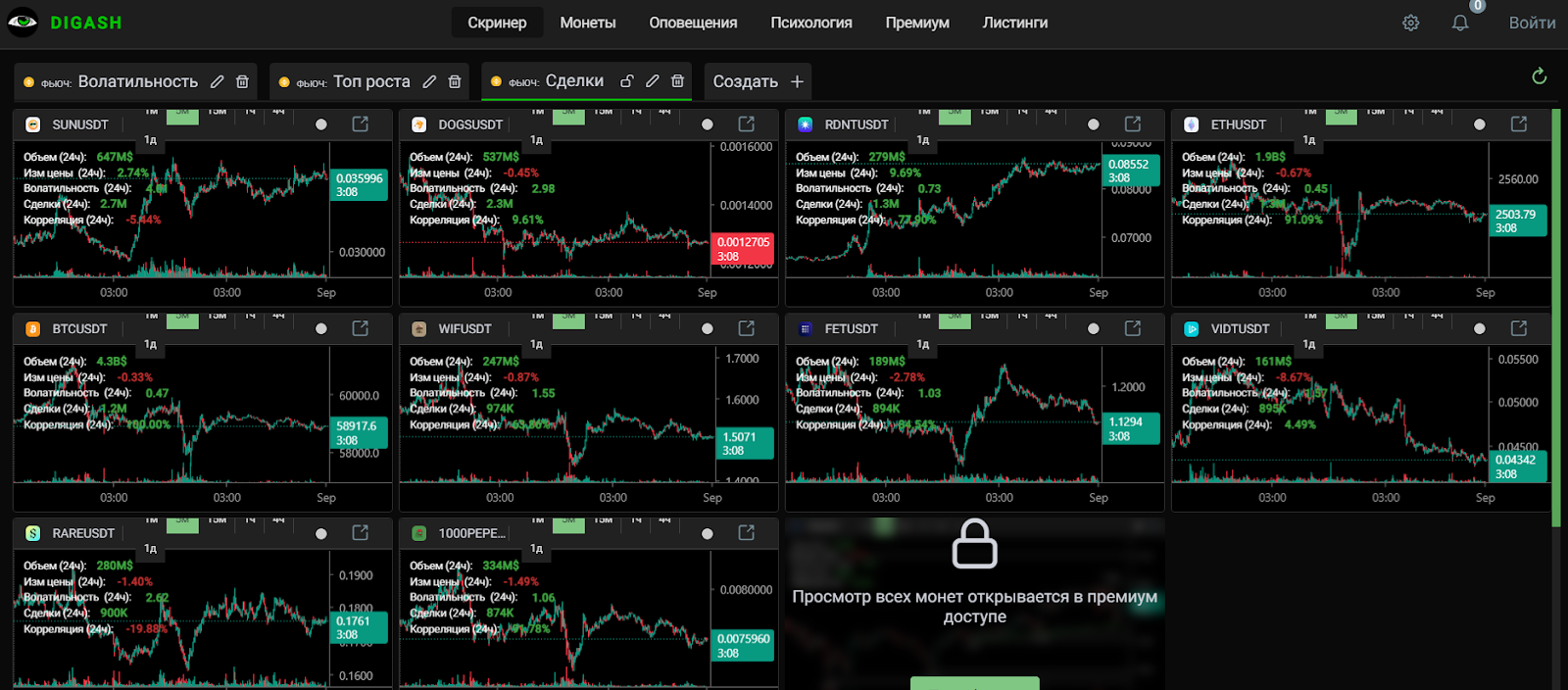 - скринер — находит крипту по заданным параметрам, например, по волатильности или росту за 24 часа;