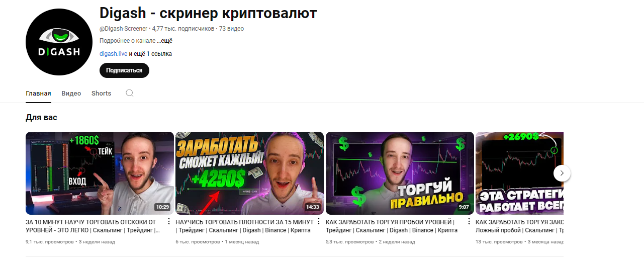 - Digahsh скринер криптовалют — Ютуб канал, аудитория около 5 тысяч человек, видео инструкции, онлайн торговля, обучение и многое другое в бесплатном доступе.