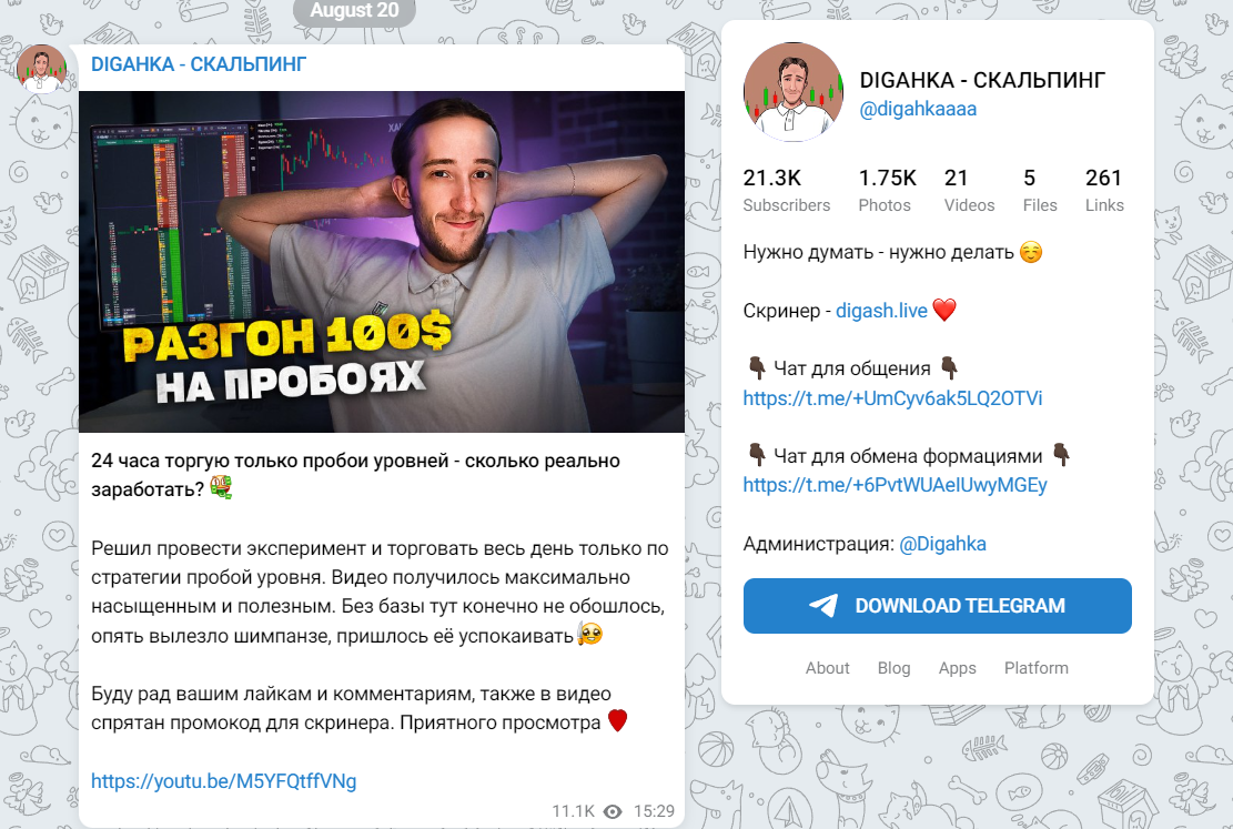 - Digahkaaaa — Телеграмм канал, на который подписано более 21 тысяч человек. Автор публикует обновления софта, стратегии для торговли, психологию трейдера и многое другое.