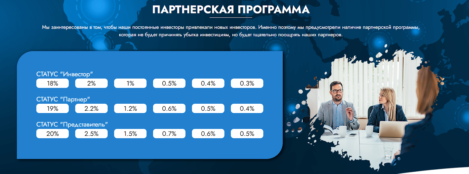 Еще один вид дохода на платформе — партнерская программа. Заработок в Digital Money возможен по 7 линиям, но также зависит от статуса клиента:- Инвестор — 18% с первой линии, до 0,3% в последней;