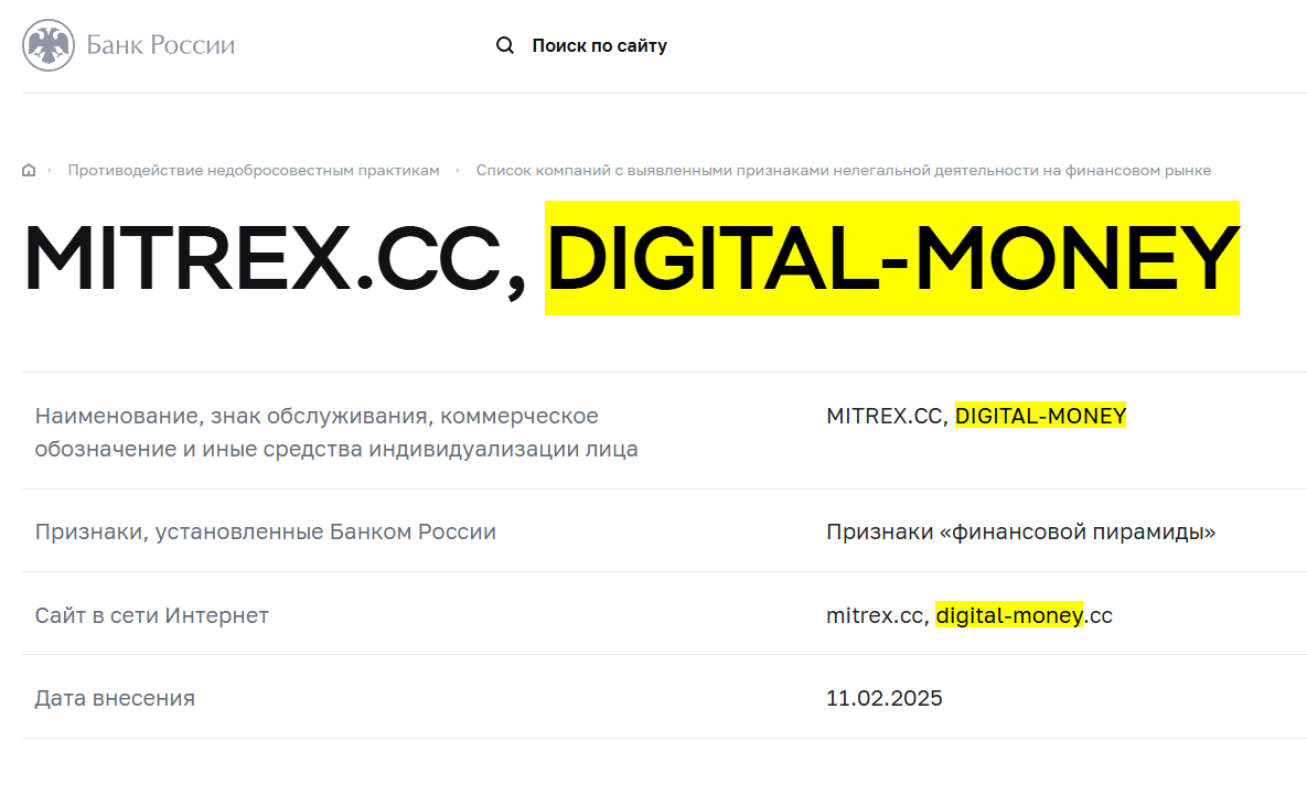 Доменное имя Digital Money Cc было зарегистрировано 20 декабря 2024 года, посещаемость платформы нулевая. Это первый негативный момент. На сайте указано, что работа ведется легально от имени ООО Digital Money Инвестментс, но такой компании в налоговой не зарегистрировано. Зато контора нашлась в реестре Центрального Банка России, там она внесена в черный список с пометкой “финансовая пирамида”. Из контактов на сайте есть только ссылка на Телеграмм и адрес электронной почты support digital money Cc. Связаться с представителями можно в онлайн чате, но номера телефона контора не указывает. В разделе о компании указан адрес в Великобритании, там же сказано, что организация зарегистрирована как Digital Money LTD, а в опубликованном документе стоит название Mitrex. Еще один негативный момент.