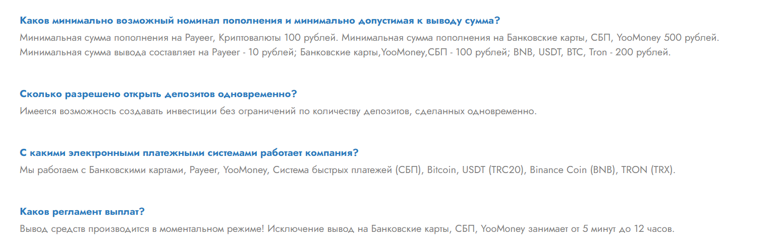 Пополнить счет можно разными способами, компания принимает крипту, подберет банковские карты или электронные платежные системы для удобства клиента. На сайте подключены Payeer, YooMoney, а из криптовалют принимают BTC, USDT, TRX и BNB. Комиссий за пополнение нет. Вывод средств не описан, нет сведений, взимаются ли комиссии, каковы верхние лимиты на снятие. Заявка рассматривается моментально, но вывод на банковские карты, через систему быстрых переводов или на Юмани может занять до 12 часов.