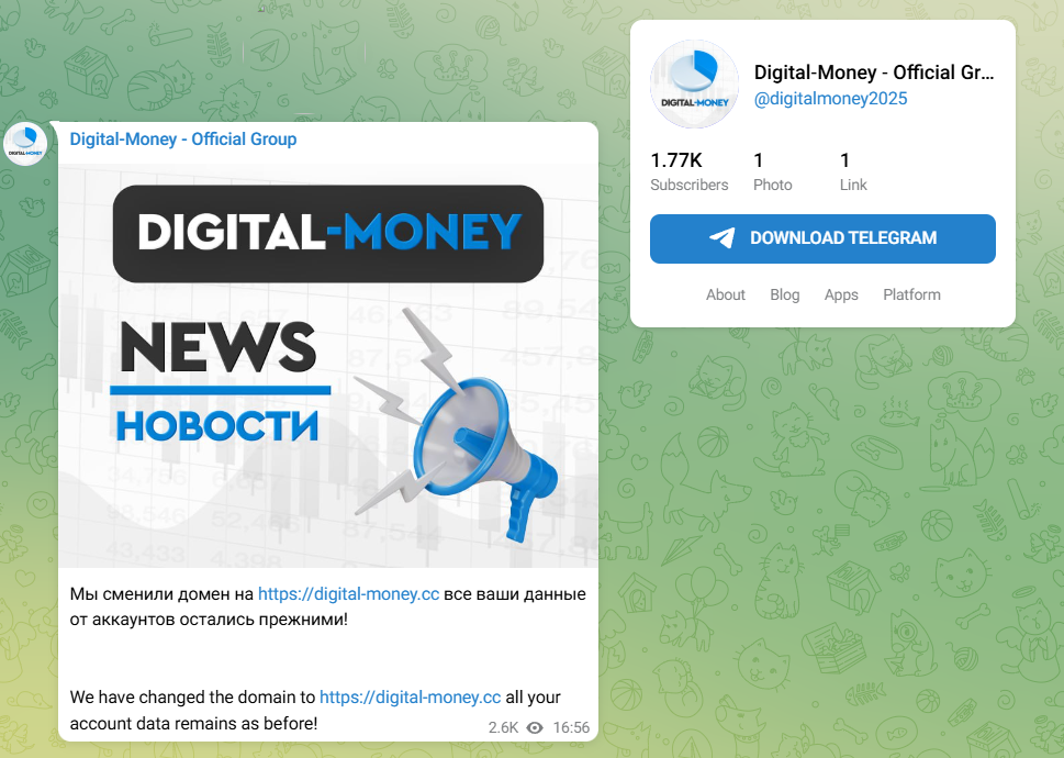 Телеграмм канал Digital Money Official Group имеет аудиторию 1700 человек. Создано сообщество digitalmoney2025 31 января 2025 года. Первый и единственный пост опубликован 16 февраля. В сообщении говорится, что платформа переехала на новый домен. Причину не называют, но этот переезд удивительным образом совпадает с блокировкой старого адреса mitrex cc и внесением проекта в черный список ЦБ РФ 11 февраля 2025 года.